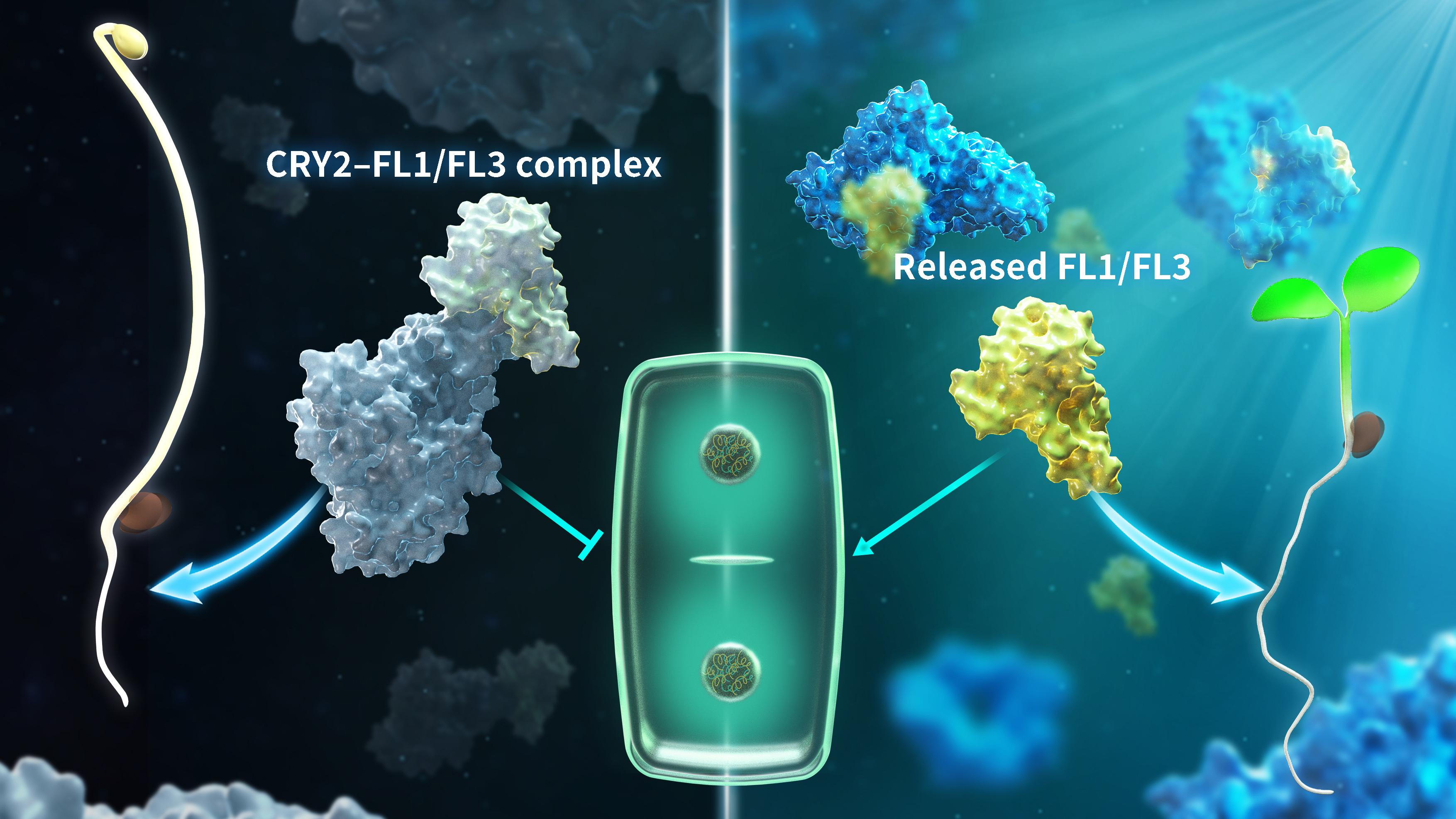 光不僅是植物光合作用的能量來源,也是調(diào)控植物發(fā)育的重要環(huán)境信號(hào)。生長(zhǎng)在黑暗中的植物幼苗下胚軸努力伸長(zhǎng)但根很短,而光下的幼苗則下胚軸短但根比較長(zhǎng)。植物在光下和暗中發(fā)育完全不同,因?yàn)橹参锕馐荏w蛋白作為植物的“眼睛”,能感知光信號(hào)從而調(diào)控植物生長(zhǎng)發(fā)育。植物具備一系列不同的光受體感受不同波段的光,藍(lán)光受體隱花素CRYs介導(dǎo)藍(lán)光調(diào)控植物下胚軸伸長(zhǎng)、開花、生物鐘等發(fā)育過程。關(guān)于CRYs的研究以往聚焦于CRYs的“藍(lán)光...