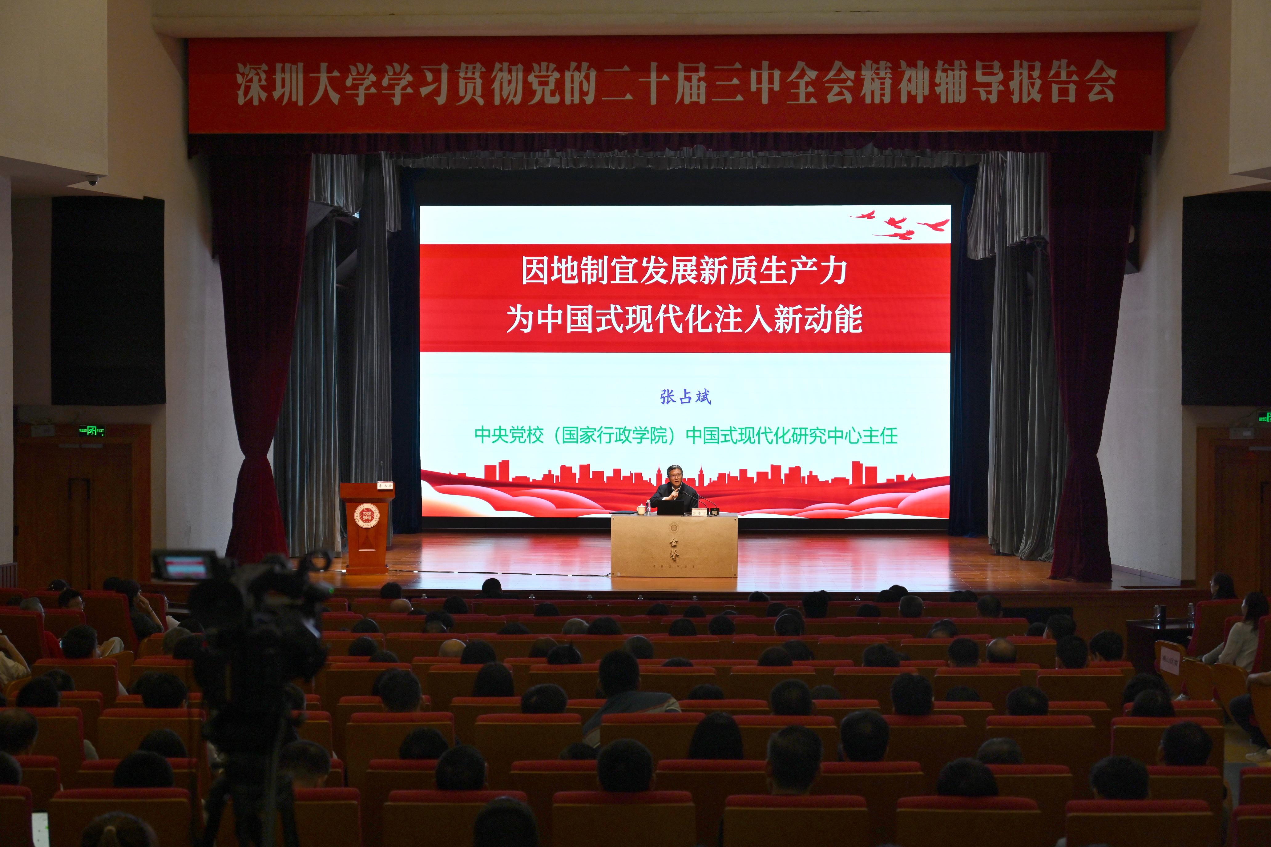 11月11日下午,深圳大學(xué)“荔園金聲講堂”暨“荔園先鋒大學(xué)堂”第七講在深圳大學(xué)粵海校區(qū)國際會(huì)議廳舉行。中共中央黨校(國家行政學(xué)院)、中國式現(xiàn)代化研究中心主任、國家哲學(xué)社會(huì)科學(xué)一級(jí)教授張占斌應(yīng)邀作《因地制宜發(fā)展新質(zhì)生產(chǎn)力 為中國式現(xiàn)代化注入新動(dòng)能》專題報(bào)告。深圳大學(xué)副校長(zhǎng)李永華主持會(huì)議,校領(lǐng)導(dǎo)、全體中層干部、黨支部書記共計(jì)400余人參加此次報(bào)告會(huì)。黨的二十屆三中全會(huì)指出,要健全因地制宜發(fā)展新質(zhì)生產(chǎn)力體制...
