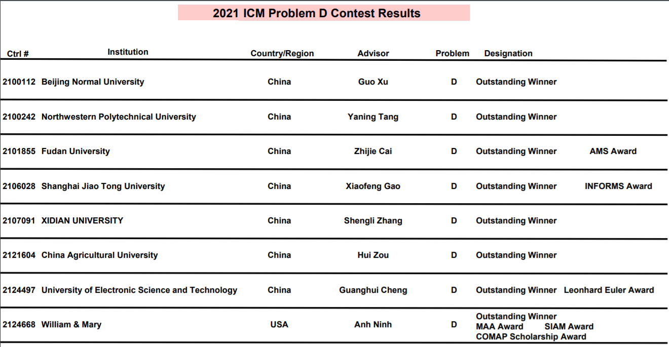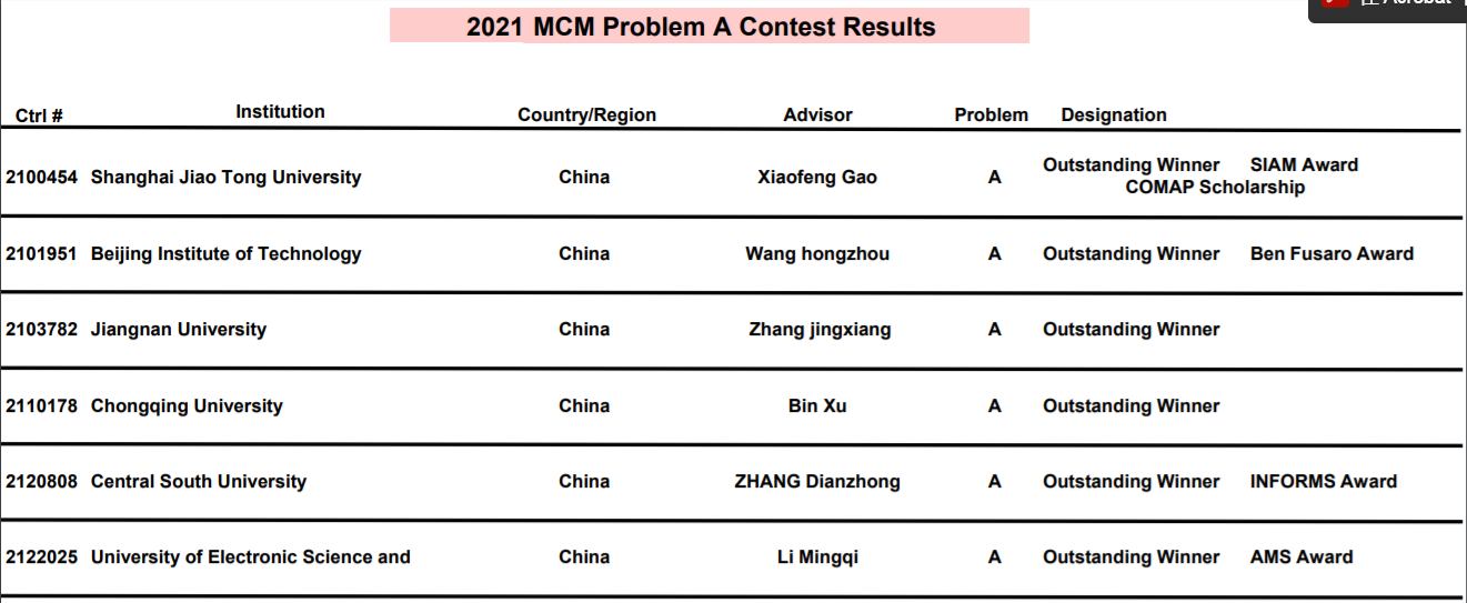 附:2021年美賽獲獎數(shù)據(jù)(引用自美賽官網(wǎng):https://www.comap.com/undergraduate/contests/mcm/contests/2021/results/)