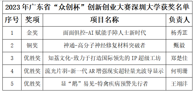 近日,2023年廣東“眾創杯”創業創新大賽在華南農業大學落下帷幕。深圳大學代表隊在1.6萬個項目中脫穎而出,斬獲一個金獎,一個銅獎,一個企業組優勝獎,兩個團隊組優勝獎,實現了歷史性的突破!