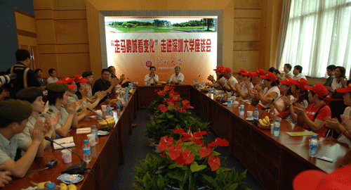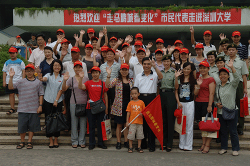 “觀察發展中的變化,聆聽變化中的故事”―昨天(9月16日)“市民巴士”駛進第13站深圳大學,深圳大學校長章必功、黨委副書記陶士平率各學院、部門負責人早早就等候在校門前,熱烈歡迎“走馬鵬城看變化”參觀團的到來。章必功深有感慨地說,“秋高氣爽的季節,如此陣容的市民代表團走進校園、走近深大,這在我們建校24年歷史上還是第一次。”