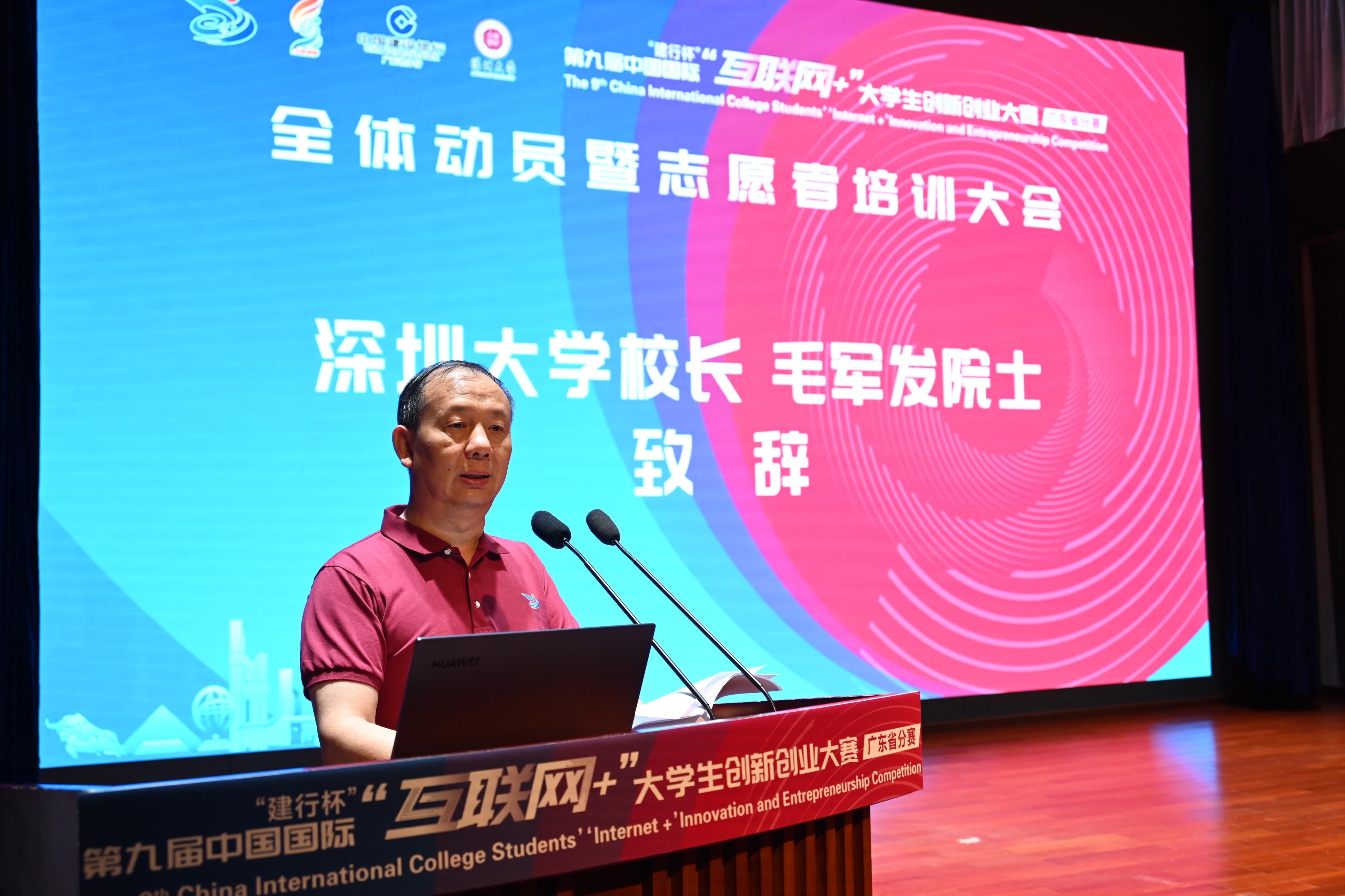 培訓大會上,毛軍發進行動員講話。他強調,深圳大學高度重視本屆“互聯網+”廣東省賽,自校賽啟動以來,相關部門廣泛宣傳賽事,挖掘優質項目,發動師生踴躍報名。全省今年報名項目總數超過45萬,參賽學生達180萬人次。最終有380個項目入圍省決賽,創造了廣東省高校入圍“互聯網+”省決賽項目數的新記錄,其中深大項目占比超過10%。毛軍發指出,深圳大學高度重視雙創教育,“互聯網+”大賽是雙創教育的重要標志性成果,希望深大參賽項目團隊全力以赴,積極備賽,發揮東道主優勢,賽出深圳特色,賽出深大水平,勇奪金牌,為校爭光,為40周年校慶獻禮。毛軍發還對參與賽事志愿者服務的師生團隊表示感謝,并強調,作為東道主,深圳大學要提高服務水平,形成良好的創新創業氛圍,高質量承辦本屆“互聯網+”大賽。他希望志愿者們把責任“擔”起來,樹立強烈的責任感與榮譽感;把神采“揚”起來,用飽滿的熱情做好服務工作,當好深圳大學的形象大使;把干勁“拼”起來,在辦好大賽的過程中相互學習、共同進步,展示深大風采,實現志愿服務和個人成長雙豐收。他希望本次大賽能夠緊扣“更廣東、更國際、更教育、更全面、更創新、更協同”的辦賽定位,實現“辦賽精彩,參賽出彩,校慶添彩”的目標。