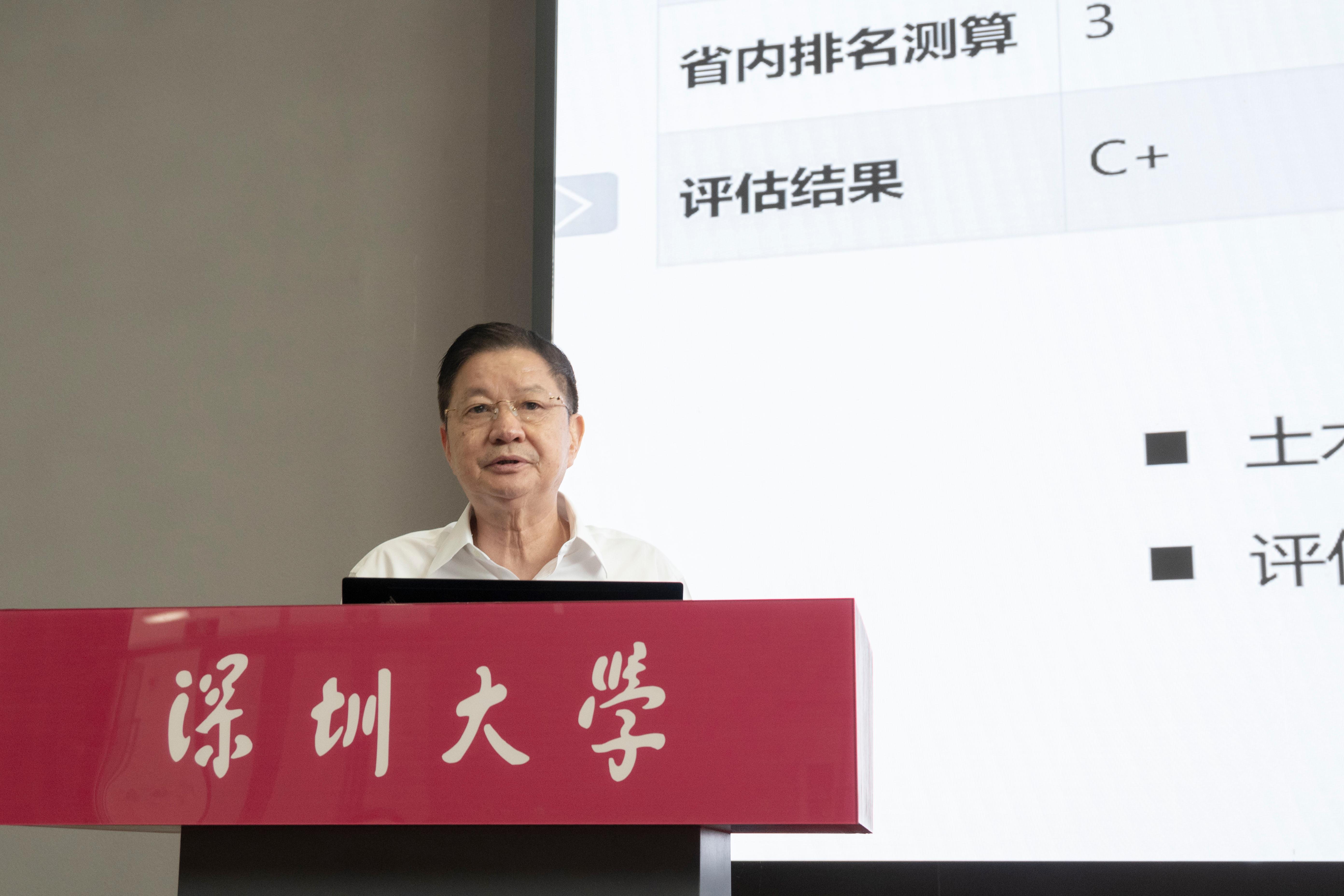 陳湘生院士在主題報告中介紹了土木工程學科創建國際巔峰學科建設情況。他表示,深圳大學土木工程學科相關團隊擁有多位尖端學者和頂尖人才,也取得了令人驕傲的成績,在諸多國家重點建設項目中作出了重大貢獻。在校領導的支持下,今年土木與交通工程學院招生新增了智慧交通和智能建造兩個專業。面對智慧城市建設的發展建設需求,深圳大學土木工程學科更要顛覆傳統的教學范式,營造包容厚重、海納百川、自由探索、尊師重教、愛崗敬業的文化和教育生態,既要培養應用型人才,也要培養研究型人才和精英人才。