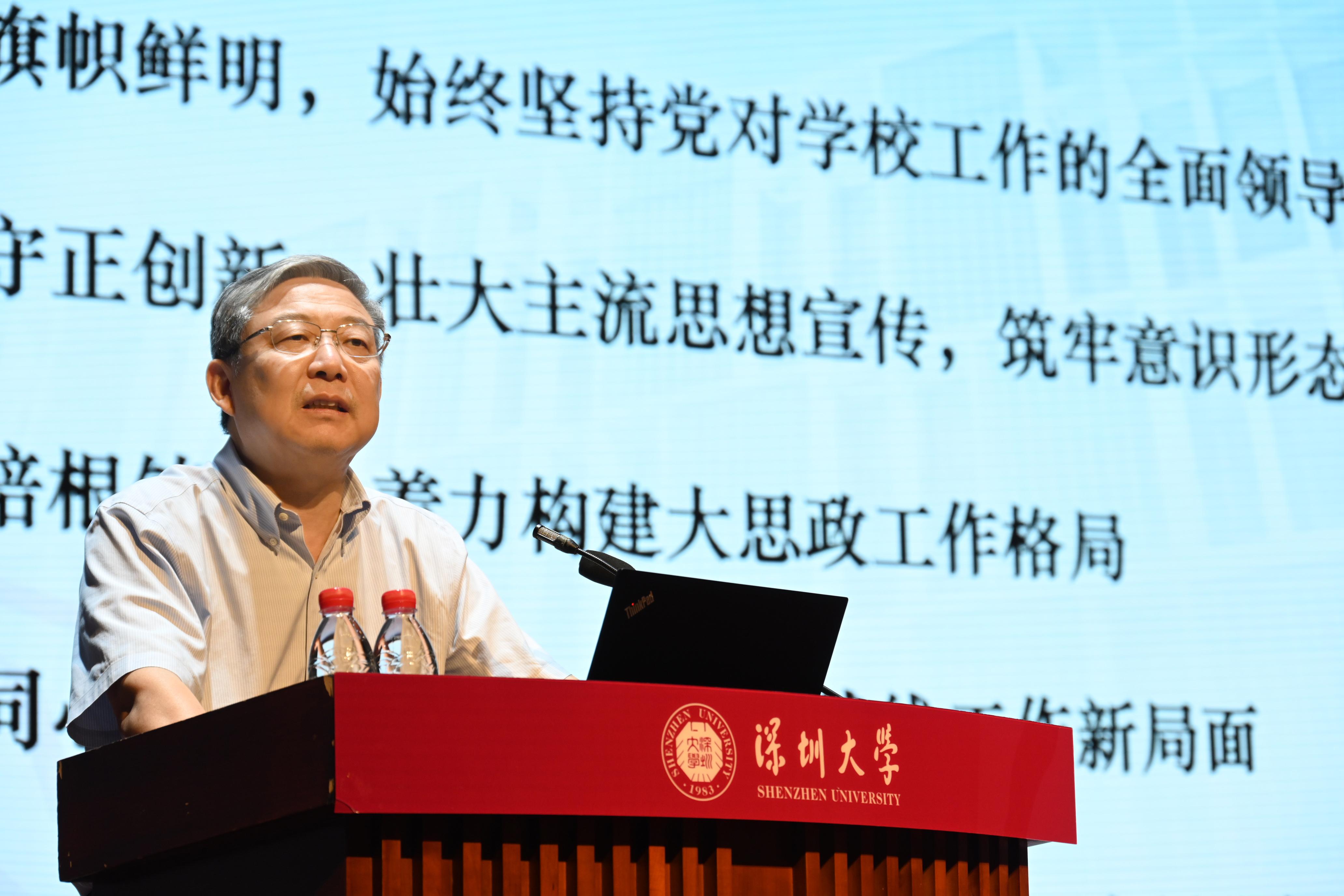 李清泉以“以高質(zhì)量黨建書(shū)寫(xiě)學(xué)校高質(zhì)量發(fā)展新篇章”為主題,對(duì)新學(xué)期黨建工作作出部署。他強(qiáng)調(diào),堅(jiān)持黨對(duì)高校的全面領(lǐng)導(dǎo)是辦好中國(guó)特色世界一流大學(xué)的根本保證。作為扎根中國(guó)特色社會(huì)主義先行示范區(qū)的大學(xué),深圳大學(xué)應(yīng)該努力擔(dān)負(fù)起特區(qū)大學(xué)的使命和責(zé)任,持續(xù)以高質(zhì)量黨建引領(lǐng)學(xué)校高質(zhì)量發(fā)展,支撐教育強(qiáng)國(guó)建設(shè),更好服務(wù)粵港澳大灣區(qū)國(guó)家戰(zhàn)略。對(duì)于新學(xué)期黨建工作理念和思路,李清泉強(qiáng)調(diào),要旗幟鮮明,始終堅(jiān)持黨對(duì)學(xué)校工作的全面領(lǐng)導(dǎo);要守正創(chuàng)新,壯大主流思想宣傳,筑牢意識(shí)形態(tài)防線;要培根鑄魂,著力構(gòu)建大思政工作格局;要同心同行,積極開(kāi)創(chuàng)統(tǒng)一戰(zhàn)線工作局面;要凝心聚力,努力營(yíng)造風(fēng)清氣正的干事創(chuàng)業(yè)氛圍。隨后,李清泉從基層黨建方面、干部工作方面、宣傳及思政教育方面、意識(shí)形態(tài)方面、紀(jì)檢方面指出了當(dāng)前工作存在的問(wèn)題,要求各單位直面問(wèn)題和不足,盡快進(jìn)行改進(jìn)。