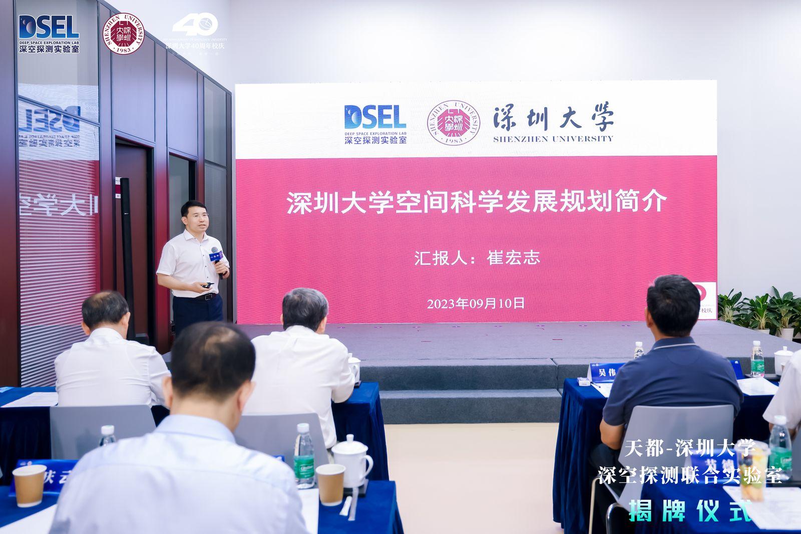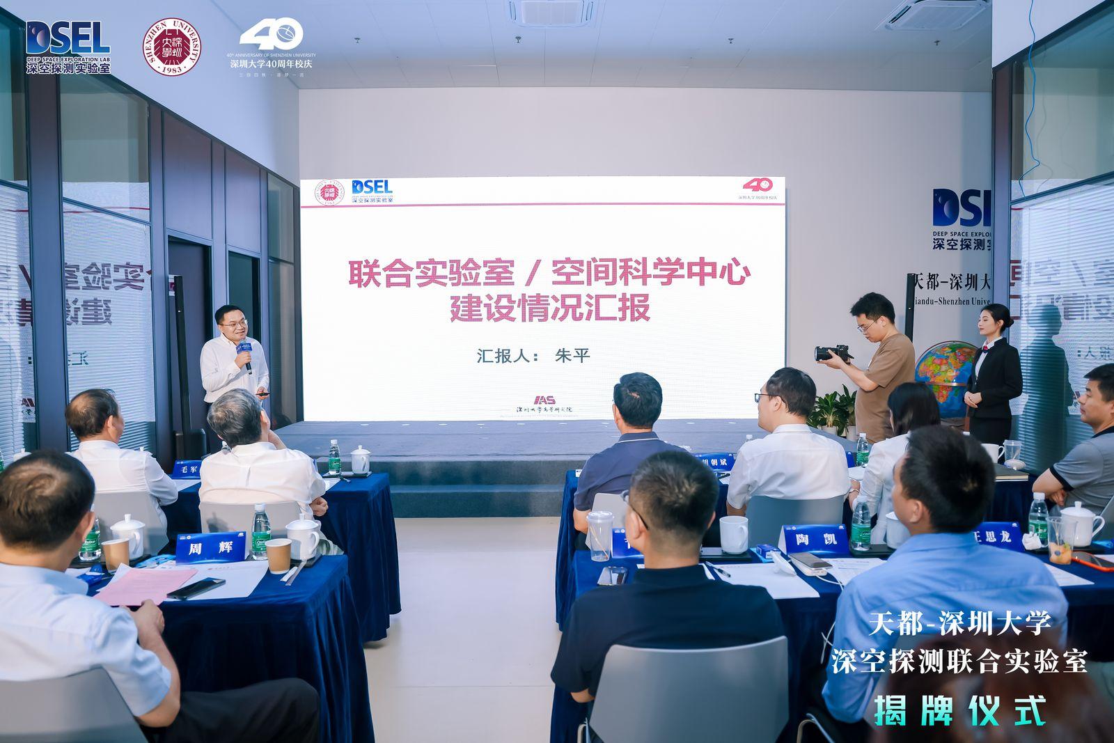 隨后,深圳大學科技發(fā)展部主任崔宏志匯報了深圳大學空間科學發(fā)展規(guī)劃,強調深圳大學高度重視深空探測聯合實驗室的建設和發(fā)展。深圳大學高等研究院朱平教授匯報了聯合實驗室和空間科學中心的建設情況,介紹了學校為支撐聯合實驗室人才隊伍建設和研究生培養(yǎng)成立的空間科學中心,并匯報了月基載荷的研制進展。