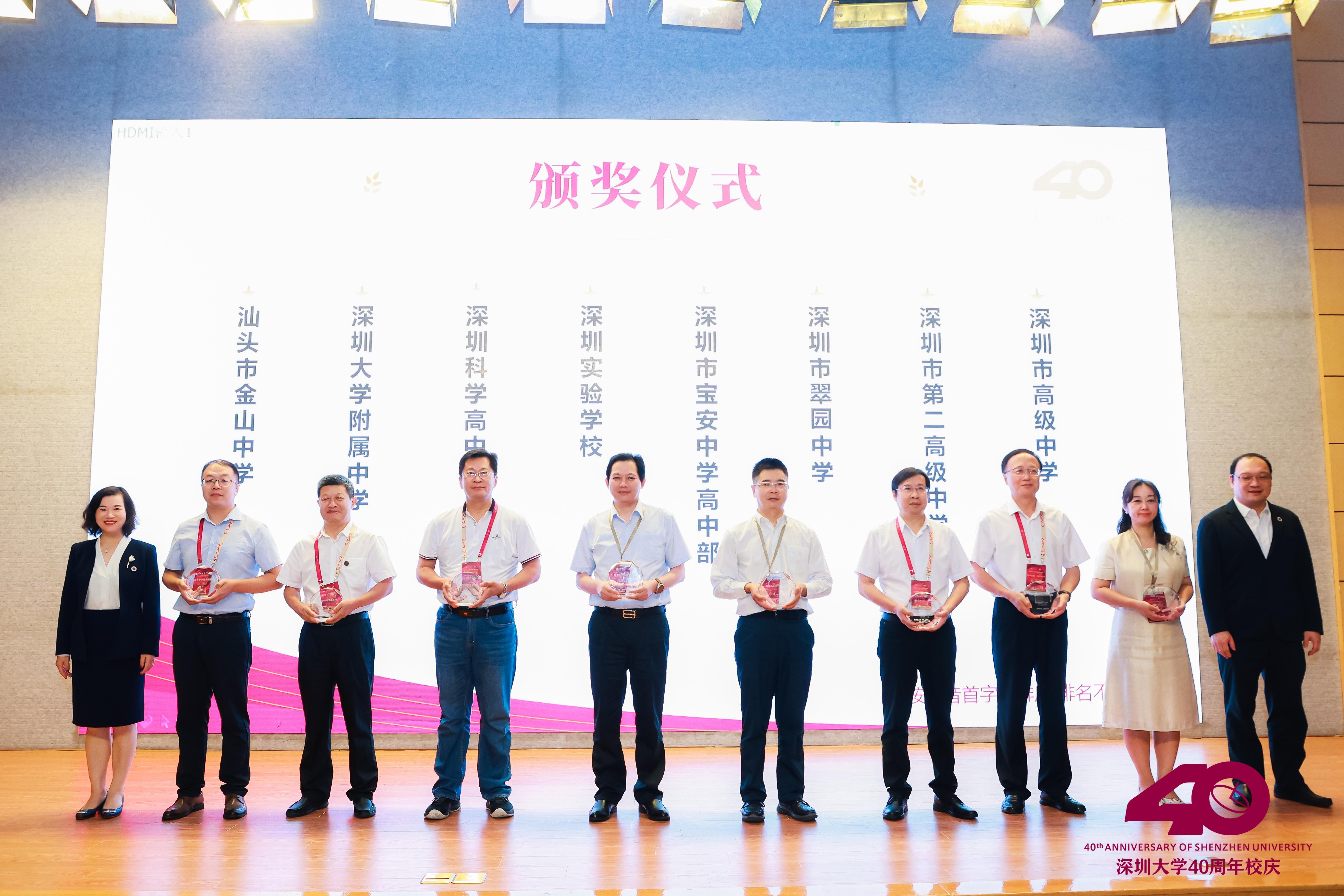 在頒獎儀式上,東莞市東華高級中學、汕頭市潮陽實驗學校、深圳中學、深圳市紅嶺中學(紅嶺教育集團)高中部、中山市中山紀念中學等50余所中學學校代表上臺領獎,張曉紅和深圳大學教務部主任袁磊為中學頒發“深圳大學卓越生源基地”獎杯。