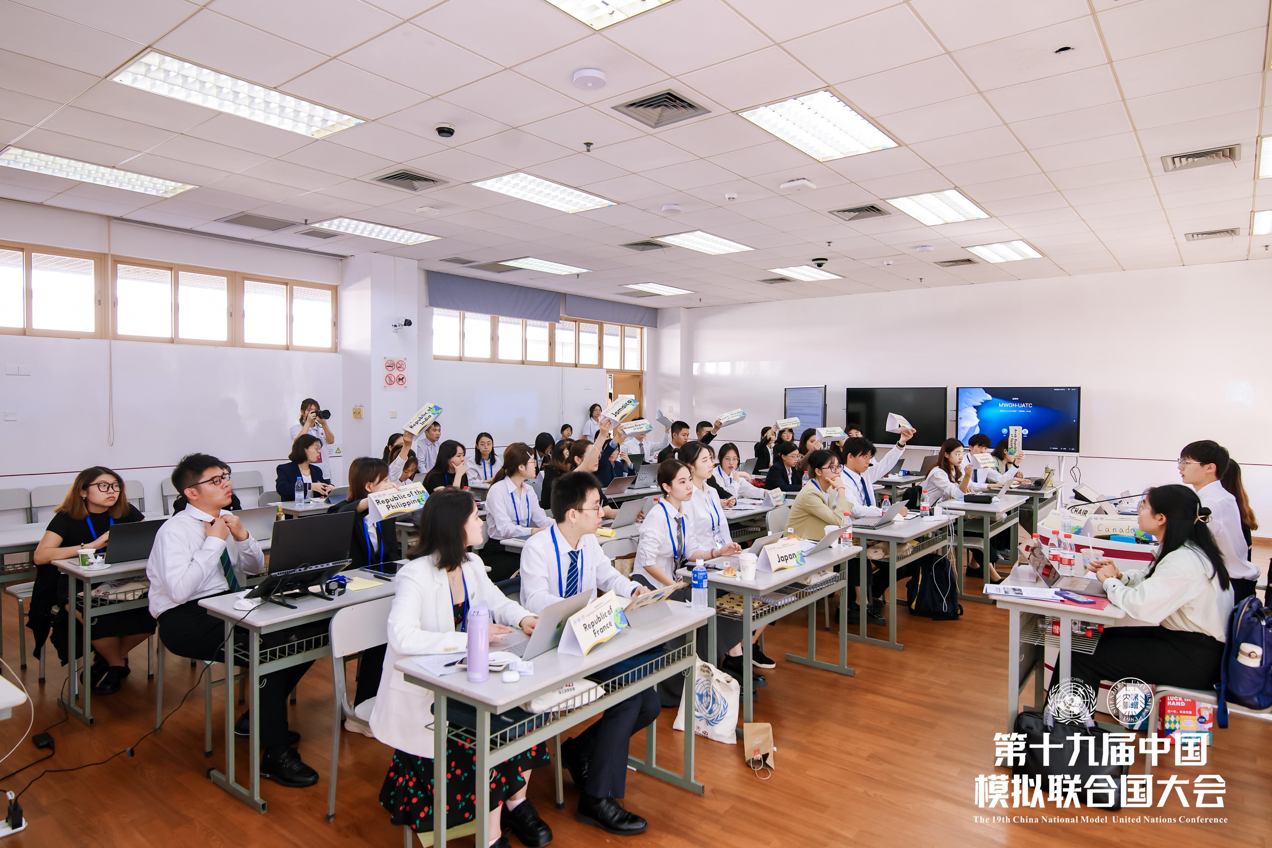 在三天的會期中,來自74所高校的近300名學生代表分別在聯合國大會第一委員會、聯合國大會第三委員會、聯合國開發計劃署、聯合國糧食及農業組織、國際民航組織、聯合國氣候變化大會、主新聞中心七個會場,模擬各國外交官,就政治安全、文化、農業、氣候、航空等發展議題展開辯論、磋商等共4輪會議。會議現場座無虛席,代表們的桌子上擺放著文件、電腦和所代表國家的桌牌,“外交官們”有條不紊地進行發言前準備。