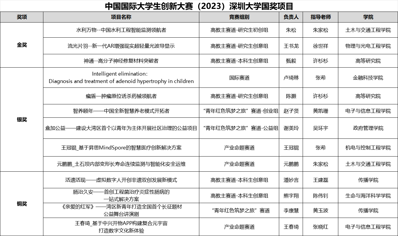 深圳大學“水利萬物——中國水利工程智能監測領航者”“神通——高分子神經修復材料突破者”“流光片羽——新一代AR增強現實超輕量光波導顯示”三個項目摘金。其中“水利萬物”項目在今年8月舉辦的中國國際大學生創新大賽(2023)廣東省分賽中一舉奪魁。