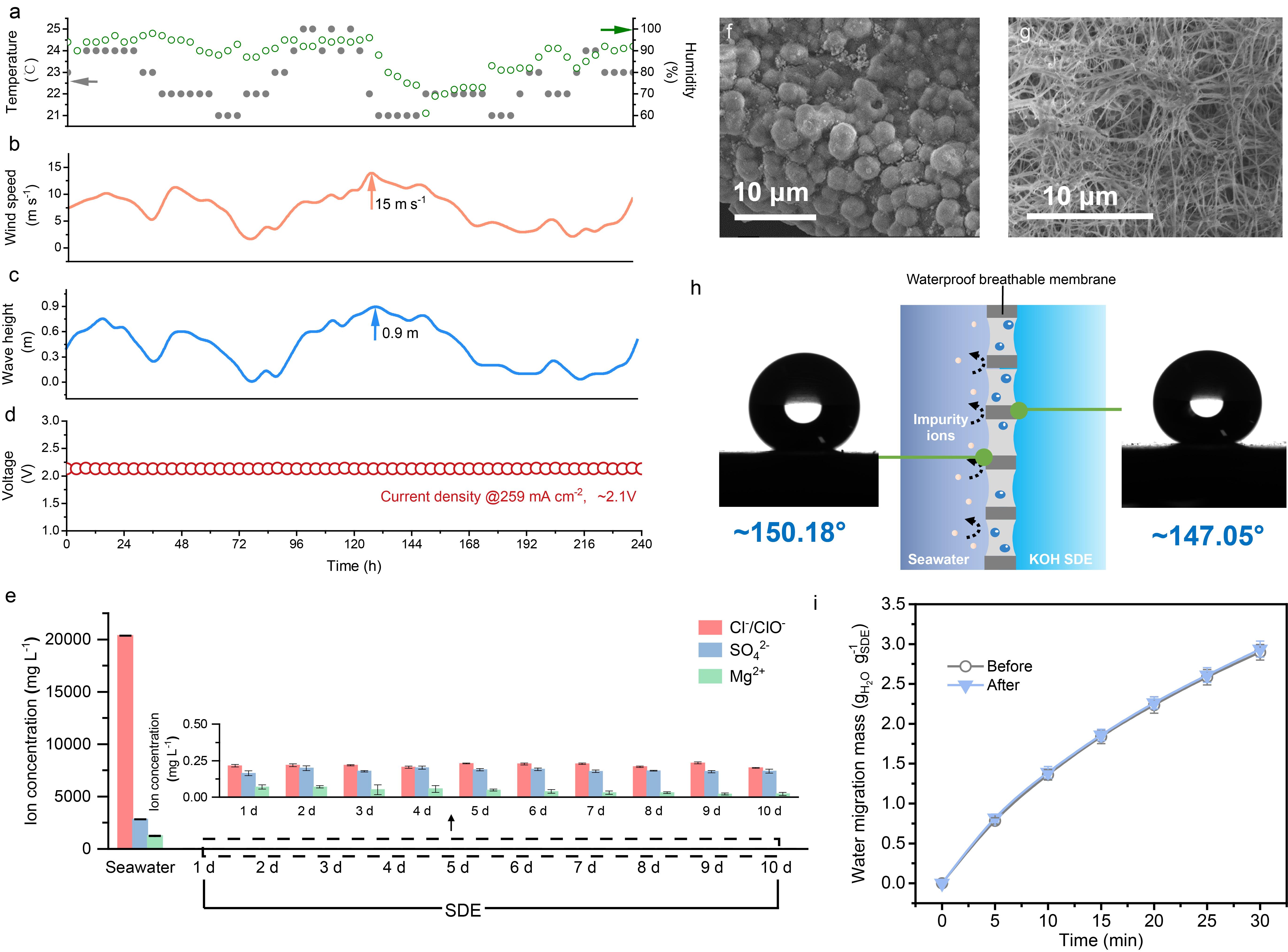 2024年6月21日,深圳大學謝和平院士團隊在Nature Communications上發表了題為“In-situ direct seawater electrolysis using floating platform in ocean with uncontrollable wave motion”的研究成果。該研究基于謝和平院士團隊2022年11月30日在Nature上發文開創的相變遷移海水直接電解制氫全新原理與技術,圍繞在真實大海中實現海水直接制氫面臨的海水多場耦合復雜工況帶來的波動性等科學難題與工程空白,提出了抵抗真實大海不可控海洋波動環境的海水直接制氫全新路徑與技術;系統研究了不同海水組分(深圳灣、興化灣)濃度變化導致的界面蒸氣壓差差異,闡明了濃度動態變化下相變遷移過程的自調控自適應機制;首次揭示了在不同海浪波形(恒流、亂流等)、波高、波寬條件下的相變遷移過程規律與影響機制,表明了在海浪一定程度沖擊下有利于防止界面濃度極化從而提升相變傳質效果;基于界面傳質面積動態變化規律建立了真實海浪波動下的相變遷移海水制氫理論模型,并在實驗室模擬海洋環境下實現了500h以上穩定性,未發生催化劑腐蝕、毒性和腐蝕性,充分驗證了電解系統、防水透氣層等核心關鍵部件在復雜環境下的耐受性與抵御能力,為在真實大海不可控波動環境下規模化海水直接電解制氫提供了理論指導并奠定未來產業化發展基礎。