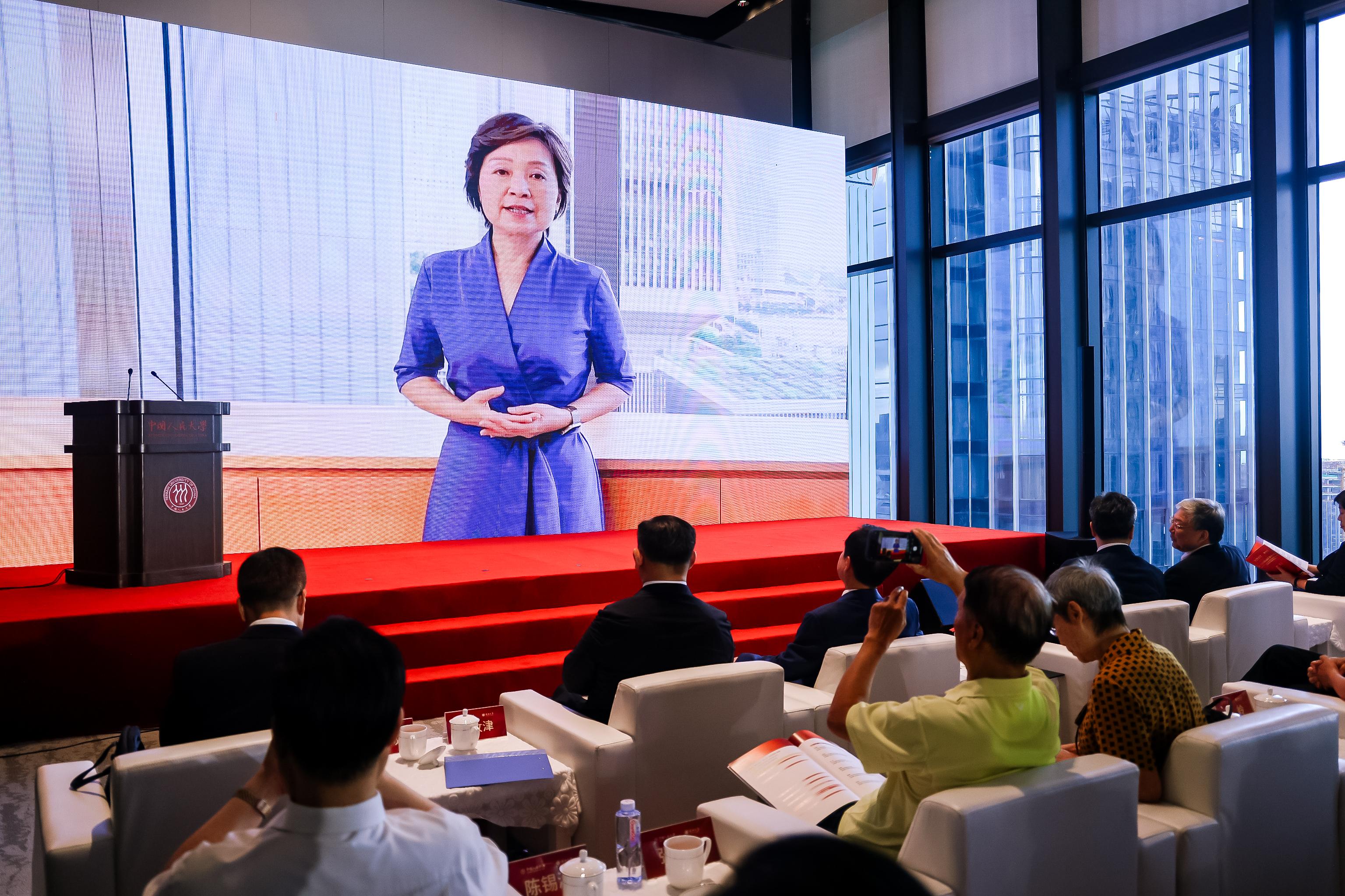 香港特別行政區教育局局長蔡若蓮以視頻形式致辭。她代表香港教育局對研討會的召開和深圳發展與戰略研究院的成立表示祝賀。她表示,由中國人民大學與深圳大學合作共建的深圳發展與戰略研究院,通過開展理論研究、社會服務、人才培養、國際交流等工作服務深圳高質量發展大局,相信研究院的成立將為促進學術界、企業界和政府部門之間的交流與合作,共同推動粵港澳大灣區教育創新與發展,提供堅實的人才和科技創新支持。香港具有背靠祖國、連通世界的獨特優勢,擁有多所世界百強大學;香港與深圳關系密切,兩地高校一直通過不同方式進行交流合作,涵蓋科研創新、人才培養等多個領域,未來希望進一步發揮好香港作為國際化橋梁與窗口的作用,深度對接粵港澳大灣區規劃融入國家發展大局,持續深化與深圳在高等教育領域的合作,凝聚優質教育資源,完善合作機制,共同推進大灣區高質量發展,為強國建設、民族復興偉業作出新的貢獻。