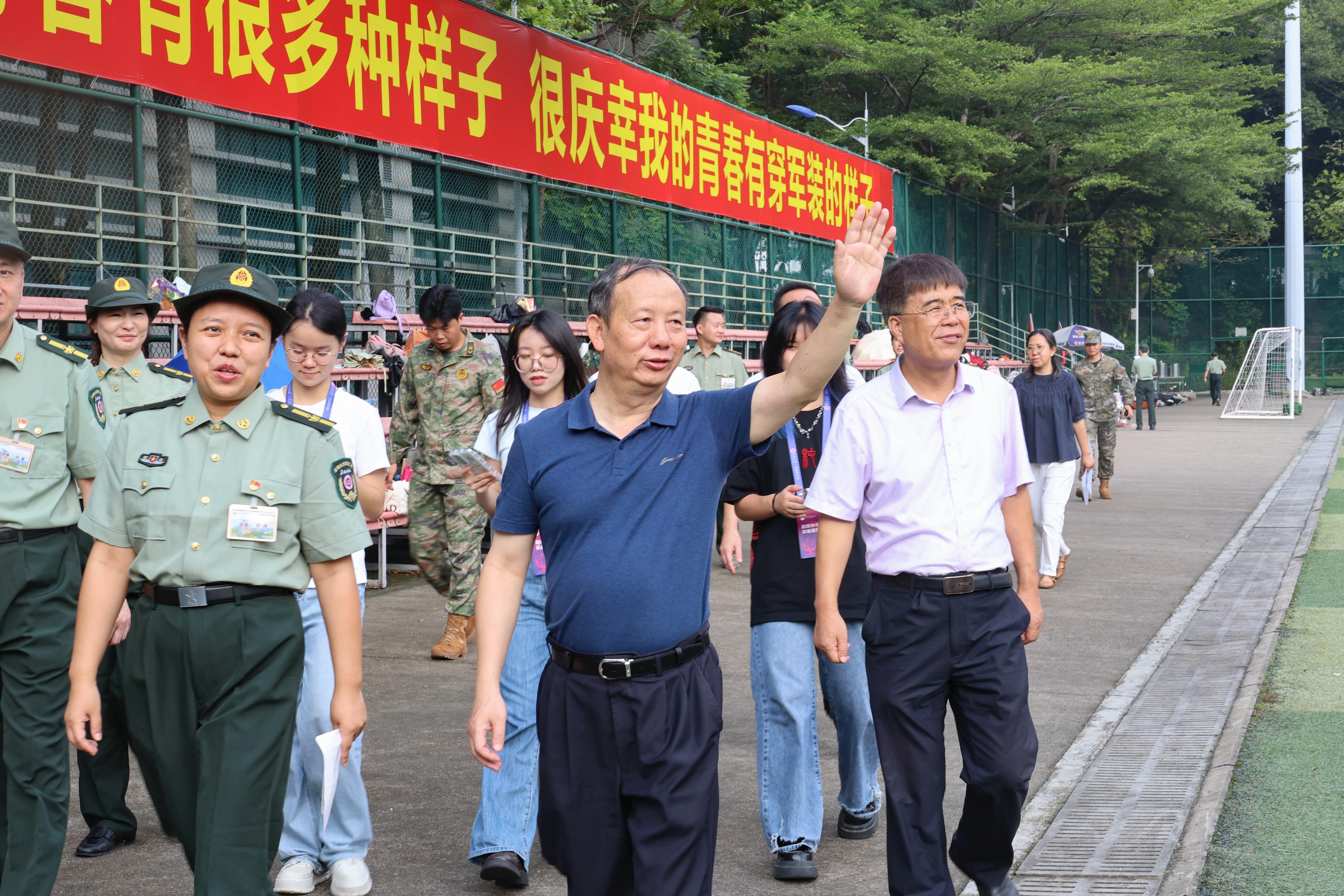 9月25-26日,深圳大學黨委書記李清泉,校長毛軍發,副校長李永華、汪永成等校領導先后到粵海、麗湖兩校區看望慰問2024級軍訓新生。學校黨政辦公室、黨委組織統戰部、黨委宣傳部、學生部、武裝部、麗湖校區管理辦公室等職能部門相關負責人以及軍訓一團、二團、三團政委陪同看望。
