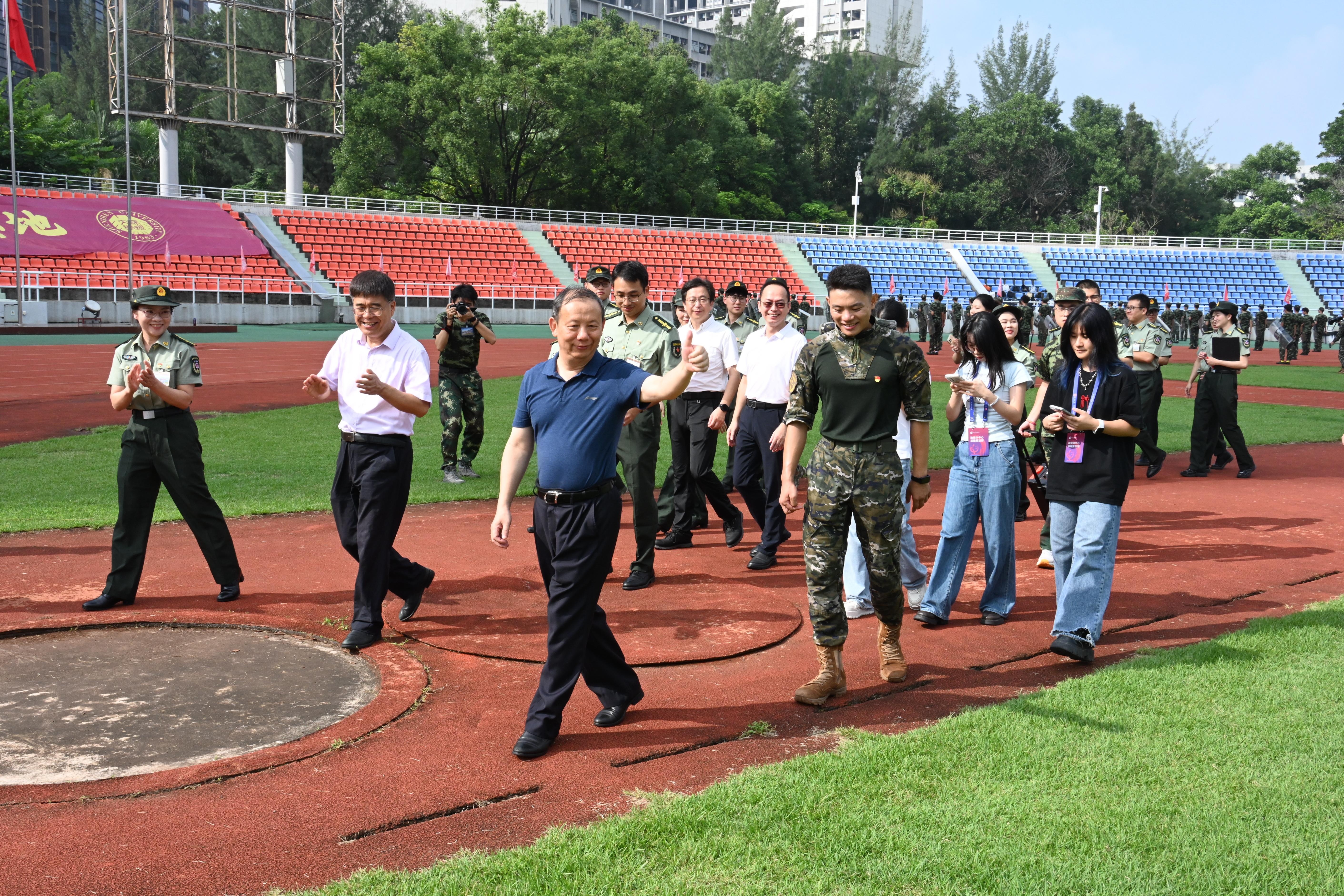 26日,毛軍發、汪永成一行到粵海校區田徑場、南區體育館,了解軍訓一團、二團訓練進展,為新生、承訓教官等送上親切的問候。新生們規范的軍姿、整齊劃一的步伐展現了團結一致、積極向上的精神面貌,毛軍發、汪永成不禁豎起大拇指表示贊賞。“看到你們這樣訓練有素的隊伍,我感到非常欣慰,非常高興。”毛軍發與新生們分享自己在中國人民解放軍國防科技大學讀書時的經歷,“我的終身遺憾之一就是沒有參加軍訓,因為當時軍校是不用軍訓的。我很羨慕你們能有這樣的經歷。”毛軍發希望新生們珍惜軍訓時光,淬煉自我,既要保持體格硬朗,又要堅持學習知識,做到“文武雙全”。“大家在一起就都是‘戰士’,我們的隊伍就是一個溫暖的大家庭!”毛軍發鼓勵新生們團結協作、相互支持鼓勵,通過軍訓收獲精神和體魄的雙重提升,培養使自己終身受益的優良品格,用嶄新的精神面貌和堅定的信念迎接大學生活。“我相信,將來你們一定會時常回憶起這段美好的經歷!”毛軍發還鼓勵新生們積極參軍報國,發揮深大學子應有的作用,為我國強軍事業作出貢獻。