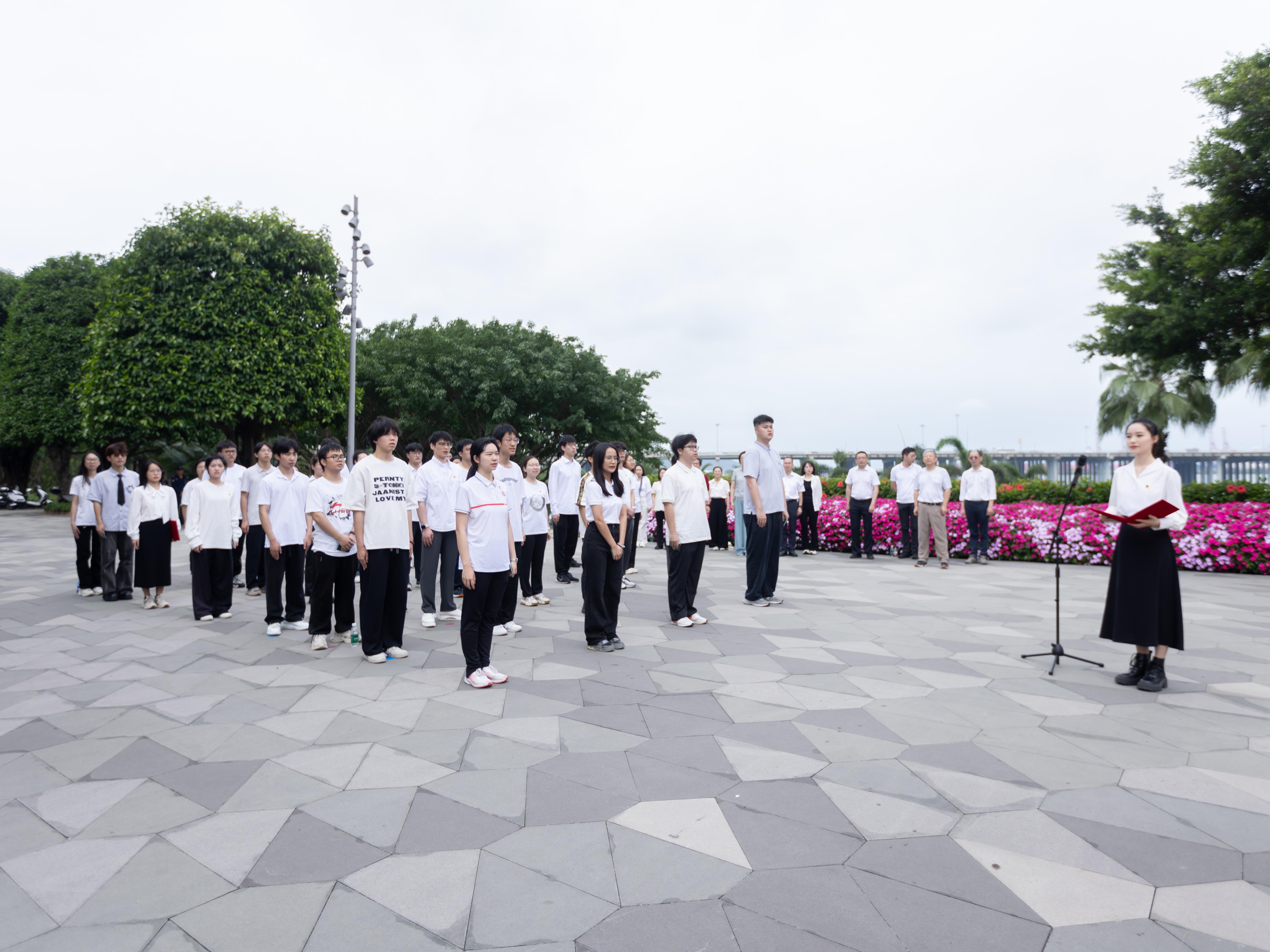 當日正值前海自貿區掛牌十周年,師生們在前海石前舉行莊嚴的入團儀式,國歌與團歌激昂回蕩,20名新團員代表接過象征責任與信仰的團徽和團員證,莊嚴宣誓,傳承五四精神,以行動踐行“請黨放心,強國有我”的誓言。