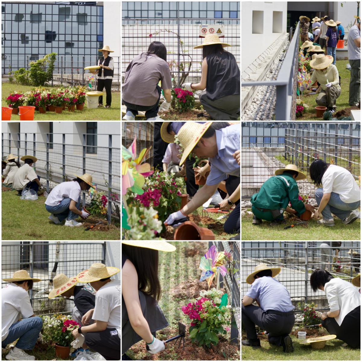 活動現場,師生分工協作,揮鍬培土、澆水固根,李永華、朱蓓薇與深港學子共同栽種簕杜鵑和紫荊樹,志愿者們為香港學院的同學分發種子紀念票。