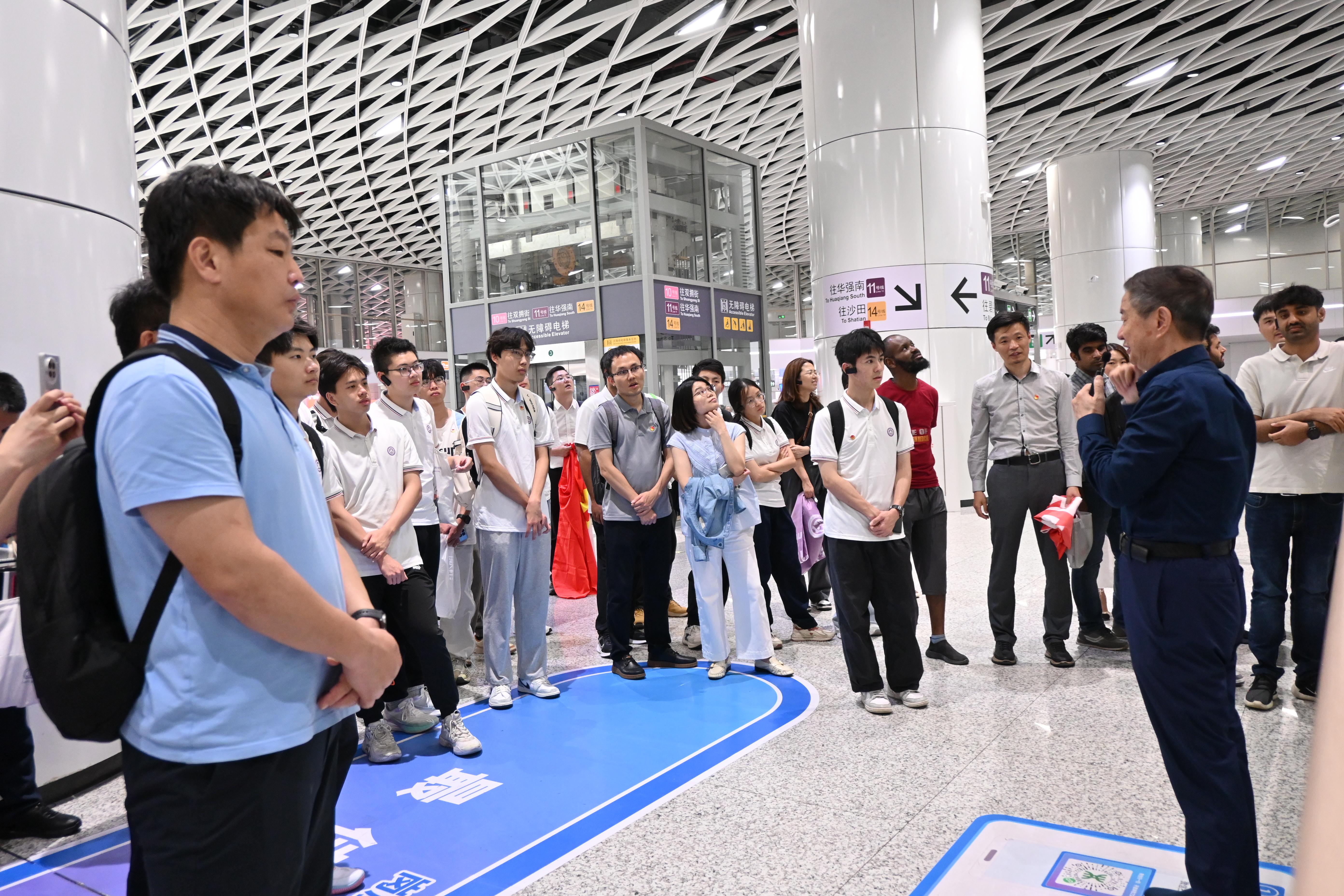 隨后,師生又來到了被譽為“中國最美地鐵站”的深圳崗廈北地下樞紐。作為五線交匯的重要交通樞紐,該站擁有22.49萬平方米的宏大體量、48×51米無柱式空間設計和融合“科技+藝術”的賽博朋克風格,令人嘆為觀止。