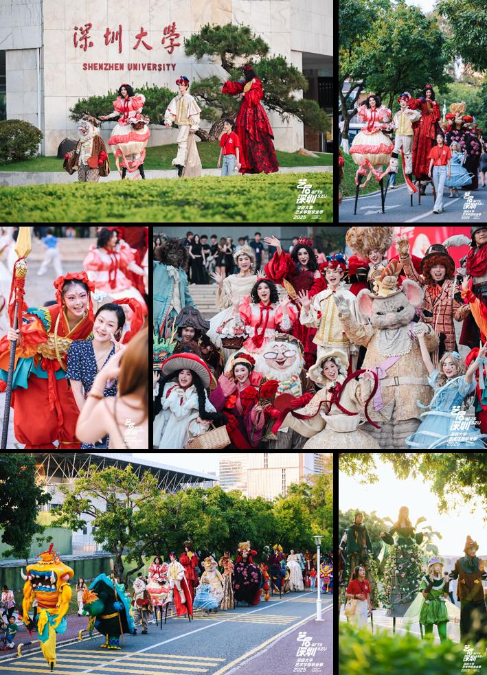 依托大學生創(chuàng)新創(chuàng)業(yè)高蹺表演訓練計劃項目,由深圳大學藝術(shù)學部戲劇影視學院表演系學生、校友以及深圳小逗號兒童劇團的演員們帶來的戲劇高蹺演出,從深圳大學美術(shù)館出發(fā),沿立德路一路前行至深圳大學演會中心,沿途吸引了眾多觀眾的目光以及現(xiàn)場互動。