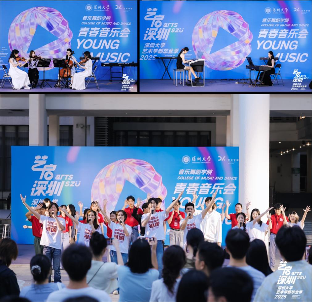 5月12日下午,在深圳大學匯德樓B座音樂廳旁小廣場,由音樂舞蹈學院帶來的青春音樂會率先開場,為觀眾帶來了9首各具特色的樂曲,流行、電子、樂器演奏等多元音樂風格燃情碰撞,展現(xiàn)了畢業(yè)生們的活力青春與對音樂的無限熱愛。