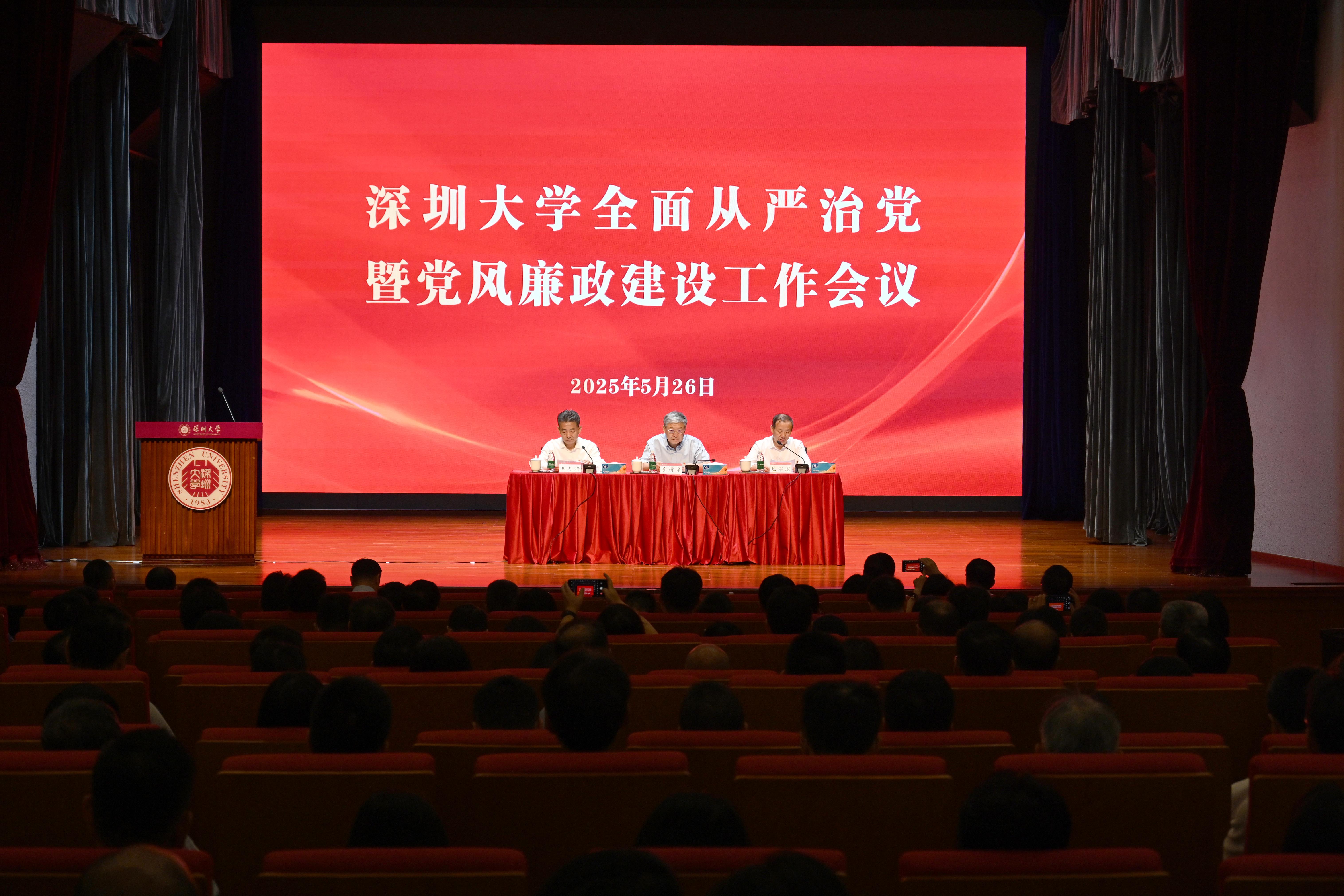 5月26日,深圳大學在粵海校區國際會議廳召開全面從嚴治黨暨黨風廉政建設工作會議、黨委理論學習中心組(擴大)學習會暨領導干部管理能力提升專題培訓班專題講座,黨委書記李清泉主持會議。全校中層干部、新聘七八級管理人員參加會議。