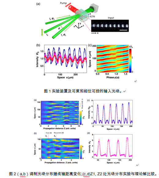 Fermi-Pasta-Ulam-Tsingou重現問題是科學家們從1955年起就不斷嘗試解決的挑戰。該問題是指某些非線性系統不會分散他們的能量,而是回到初始激發狀態。由于可積模型能夠精確預測重現行為,因此使得FPUT重現變得更加有趣,但是維持足夠長動態的可積性所涉及的困難不允許進行定量實驗驗證。針對這一問題,研究者們利用三波干涉產生具有周期性調制的光場,在光折變晶體(KTLN)中非線性傳輸,觀察到了三個周期的FPUT重現。通過調節初始輸入光場的相位和幅度,實現了FPUT重現行為的可控性。實驗結果與非線性Schr?dinger方程的理論結果非常一致。研究結果是對統計力學和非線性波理論的一次前所未有的測試,同時該空間實驗裝置為流體動力學和非線性光學中的非線性不穩定系統的控制和預測的未來發展提供了一個范式。