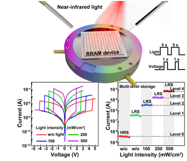 結(jié)構(gòu)簡化,功能化和多樣化是后摩爾時(shí)代電子存儲(chǔ)技術(shù)發(fā)展的主要趨勢。光電阻變存儲(chǔ)器因?yàn)槠浣Y(jié)構(gòu)簡單,易于集成和存儲(chǔ)密度高等優(yōu)點(diǎn),成為當(dāng)前研究熱點(diǎn)。然而當(dāng)前研究主要集中在利用紫外光或可見光來調(diào)控光電存儲(chǔ)器。與紫外光或可見光相比,近紅外光具有較大的生物穿透深度且對(duì)組織無損傷,在植入式和可穿戴柔性電子設(shè)備中具有更光明更廣闊的應(yīng)用前景,然而因?yàn)槠涔庾幽芰枯^小,無法激發(fā)大多數(shù)半導(dǎo)體材料。因此如何利用近紅外光調(diào)控阻變存儲(chǔ)器并進(jìn)而實(shí)現(xiàn)多比特存儲(chǔ)是一個(gè)迫切需要解決的科學(xué)問題。針對(duì)上述技術(shù)問題和挑戰(zhàn),該課題組巧妙設(shè)計(jì)了二硫化鉬和上轉(zhuǎn)換納米顆粒的復(fù)合材料(MoS2–Upconversion-Nanoparticle),并將這種材料應(yīng)用于阻變存儲(chǔ)器中。于上轉(zhuǎn)換材料可以吸收近紅外光然后發(fā)射可見光,而發(fā)射出的近紅外光可以再次激發(fā)二硫化鉬產(chǎn)生激子;同時(shí)產(chǎn)生的激子可以在二硫化鉬/上轉(zhuǎn)換顆粒異質(zhì)結(jié)界面分離成電子和空穴改變材料導(dǎo)電能力。通過改變近紅外光光照強(qiáng)度,阻變存儲(chǔ)器電阻態(tài)會(huì)相應(yīng)改變,表現(xiàn)出多級(jí)存儲(chǔ)特征,提高了存儲(chǔ)器存儲(chǔ)密度。本實(shí)驗(yàn)不僅填補(bǔ)了利用近紅外光調(diào)控阻變存儲(chǔ)器的空白,而且可以將其應(yīng)用于電子眼等設(shè)備中,為下一代高性能光電存儲(chǔ)器及光電器件的開發(fā)和集成提供了新思路。