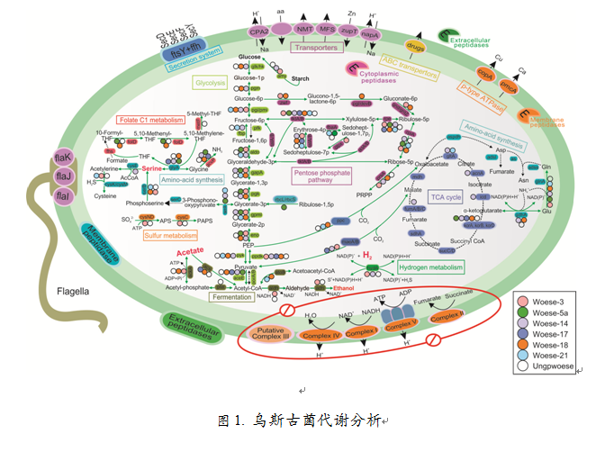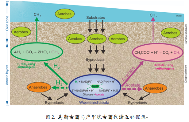 自1977年Carl Woese提出“三域?qū)W說”,將地球生物劃分為Achaea (古菌),Bacteria (細菌), Eukarya (真核生物)。古菌研究是微生物界熱點話題之一,已由最初的2個門(phylum)發(fā)展到如今28個。為紀念Carl Woese對生物進化分類學突出貢獻,Jill Banfield等將DPANN超級古菌門中一個新發(fā)現(xiàn)古菌門命名為Woesearchaeota(烏斯古菌),并揭示該古菌在厭氧碳循環(huán)過程中扮演著極為重要的角色。然而,烏斯古菌作為一類重要的古菌,其生態(tài)分布、進化及代謝功能鮮有報到。課題組基于這一類古菌的全球分布統(tǒng)計、進化分析、基因組和功能代謝預測研究為烏斯古菌的生態(tài)分布、進化分類及其代謝潛能奠定了新的基礎。李猛教授團隊與香港大學生物科學學院顧繼東教授、加州大學貝克利分校Jill Banfield教授、德國杜伊斯堡-埃森大學Alexander J. Probst教授合作,采用生物信息學技術(shù)手段,從進化角度將該古菌劃分為26個亞群。通過基因組分析發(fā)現(xiàn),烏斯古菌具有高度代謝缺陷(圖1),很可能通過代謝互補方式與產(chǎn)甲烷古菌存在共生關(guān)系(圖2)。研究結(jié)果對于認識烏斯古菌在生態(tài)環(huán)境中的作用,尤其是甲烷產(chǎn)生等方面都有十分重要的意義。