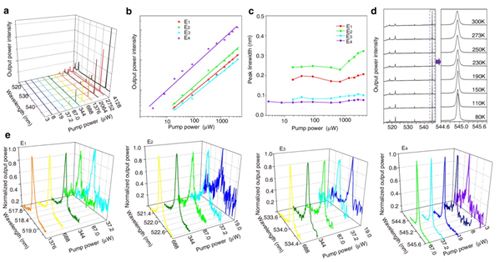 圖3(a)在不同泵浦功率514.5nm激光激發(fā)下得到的激光光譜;(b)拉曼納米激光功率密度隨泵浦功率的變化曲線;(c)拉曼納米激光峰E1-E4的線寬隨泵浦功率的變化曲線;(d)不同溫度下的拉曼納米激光光譜;(e)不同泵浦功率密度514.5nm激光激發(fā)下E1-E4的激光光譜圖。