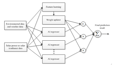 太陽能發電預測是電力能源系統經濟、安全運行的重要環節。本文首先對人工智能預測方法、參數優化和預測結構展開了分類、命名和統計分析研究,總結了各種預測方法的優缺點。其次,本文提出了一種新的人工智能預測結構。該預測結構分為特征學習、權重更新和多元回歸三個部分,如圖1所示。特征學習用于提取環境數據和時序數據的潛在特征,并作為權重更新的輸入。權重更新則用于優化多元回歸的權重系數。多元回歸負責太陽能發電預測輸入和輸出的數學建模。該預測結構最大的優點是其強大的兼容性,可兼容已有的大部分神經網絡算法,如支持向量機、深度學習和循環神經網絡等。最后,本文對太陽能發電預測的熱點方向和潛在問題進行了深入剖析。