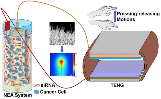 電轉染技術能將基因片段高效遞送到目標細胞和組織中,但在電轉染過程中的高電壓及其產生的熱量會導致細胞的不可逆損傷和死亡,楊成彬博士利用摩擦起電及靜電感應耦合的摩擦納米發電機(TENG),將人體運動的機械能轉換為電能,增強納米針-細胞界面的局域電場,將電穿孔過程中的細胞損傷降到最小。該自驅動的電穿孔基因轉染系統在基因功能學、基因治療以及細胞免疫治療等方面具有廣闊的應用前景。