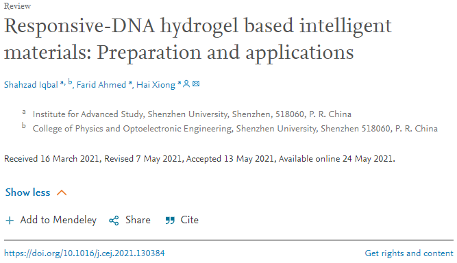近日,深圳大學高等研究院-熊海研究員課題組在化工領域Top期刊Chemical Engineering Journal(2019年影響因子: 10.6,中科院一區)上成功發表一篇題為“Responsive-DNA hydrogel based intelligent materials: Preparation and applications”的綜述論文。該論文有幸被編輯推薦為封面論文,正在評選中。