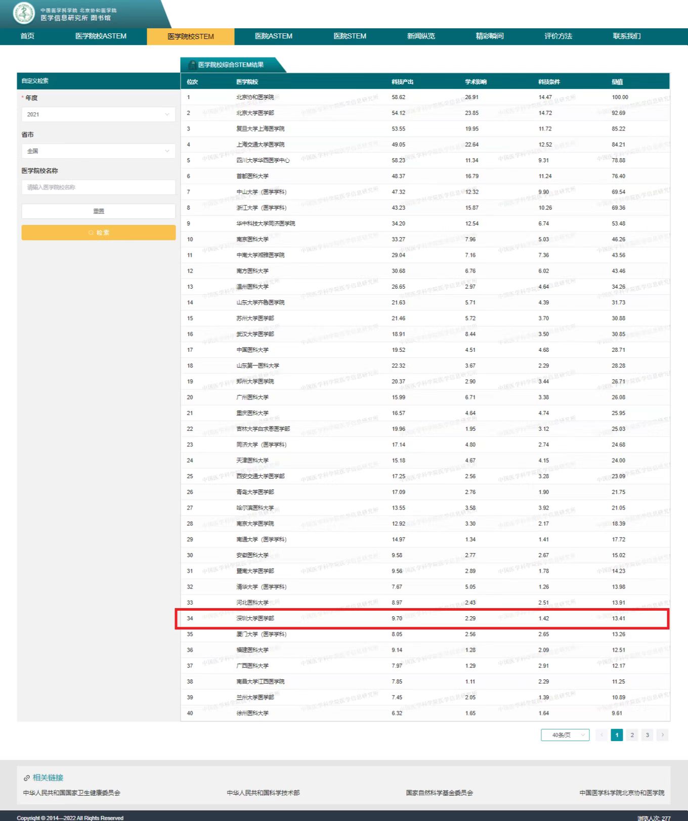8月4日,中國醫學科學院發布了2021年度中國醫院/醫學院校科技量值(STEM)以及中國醫院/醫學院校五年總科技量值(ASTEM)排名。深圳大學醫學部的科技量值排名自2018年起持續上升,并從2020年排名41位上升到2021年排名34位,并在首次發布的五年總科技量值排名中位列38。