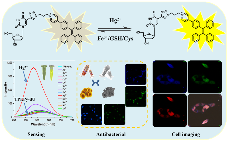 摘要圖:有機合成的多功能核苷-AIE探針:Hg2+和Fe3+/GSH/Cys的可逆響應、生物成像和抗菌。