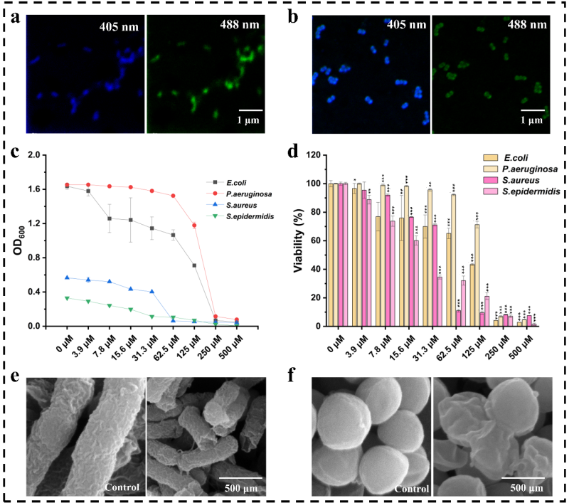 圖:(a).大腸桿菌和(b).金黃色葡萄球菌分別在405和488nm激光激發下與TPEPy-dU孵育10分鐘后的CLSM圖; (c).不同濃度的TPEPy-dU對大腸桿菌、銅綠假單胞菌、金黃色葡萄球菌和表皮葡萄球菌生長的抑制作用與培養時間的關系; (d).細菌細胞活力評估處理18小時。注:與對照組相比,ns無顯著差異,**P<0.01,***P<0.001, ##P<0.01; (e).大腸桿菌和(f).金黃色葡萄球菌的SEM圖;注:左圖---沒有處理的空白;右圖---用TPEPy-dU處理4小時)。