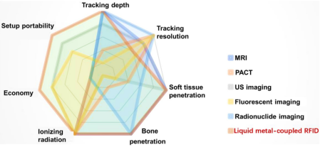 圖3. 現有主流追蹤策略和液態金屬耦合RFID定位設備的特征比較