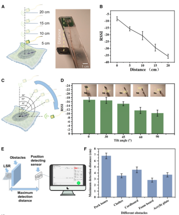 為了系統地驗證液態金屬耦合RFID定位裝置的追蹤效能,研究團隊進行了一系列定量實驗,這些實驗考察了在不同條件下RFID檢測信號的性能。具體包括:在多足機器人與RFID檢測器之間不同的距離、存在不同類型障礙物情況下,以及機器人相對于檢測傳感器的不同法線方向和傾角下的信號響應。實驗結果表明,在厘米級距離以及多種檢測角度下,對多足機器人進行有效的體內跟蹤是可行的。這些研究為RFID技術在復雜生物環境中的應用提供了重要的實驗支持。