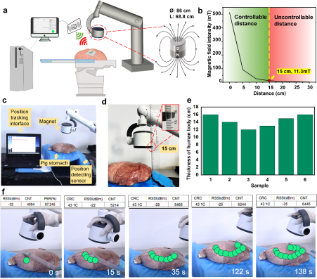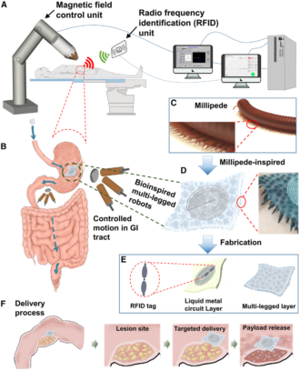 圖1. 在磁性致動單元和射頻識別定位系統下多足機器人的胃內遞送的示意圖