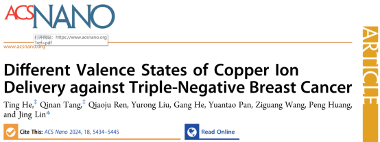近日,深圳大學醫學部生物醫學工程學院林靜特聘教授團隊在國際頂級學術期刊《ACS Nano》(影響因子17.1,中科院一區,TOP期刊)上發表了題為《Different Valence States of Copper Ion Delivery against Triple-Negative Breast Cancer》的研究論文。醫學部助理教授賀婷、碩士研究生唐祁南為第一作者,林靜教授為通訊作者,深圳大學為唯一完成單位,該團隊所在的生物醫學工程學科屬于廣東省優勢重點學科。