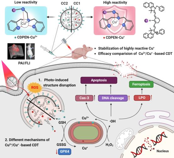 在生物體內,銅離子被認為是參與多種氧化還原反應的核心,與調控腫瘤細胞的增殖和凋亡過程密切相關。然而,關于不同價態銅離子在抗腫瘤機制中的作用尚不明確。本研究設計了一種銅離子或亞銅離子的遞送系統,離子通過與N,N-二(2-吡啶甲基)乙二胺修飾的花菁分子形成配合物,再包裹成納米顆粒,可將不同價態的銅離子遞送至腫瘤部位。在含氮基團的保護下,銅離子或亞銅離子能穩定地維持其價態;在激光照射下,花菁分子的結構被破壞,隨后釋放出銅離子或亞銅離子,觸發腫瘤部位的類芬頓反應,產生羥基自由基導致細胞脂質過氧化積累,從而殺死腫瘤細胞。本研究系統地對比了兩種不同價態銅離子在抗腫瘤生物學效應上的差異,結果表明亞銅離子表現出更好的抗腫瘤效果。進一步的機制研究揭示,亞銅離子無需谷胱甘肽還原,其產生羥基自由基更快,因此,亞銅離子遞送系統展現出更好的抗腫瘤療效。該研究為深入理解生物體內不同價態銅離子的生物學效應提供了理論依據。