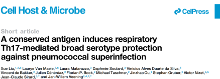 醫學部卡爾森國際腫瘤中心劉雪課題組與瑞士的Jan-Willem Veening課題組、法國的Jean-Claude Sirard課題共同在《Cell Host & Microbe》期刊上發表了題為“A conserved antigen induces respiratory Th17-mediated serotype-independent protection against pneumococcal superinfection”的文章。深圳大學為第一完成單位,深圳大學醫學部劉雪副教授和法國巴斯德所Laurye van Maele為共同第一作者,劉雪副教授課題組博士后區錦釗作為共同作者在LafB的功能闡釋方面做出了顯著的貢獻。