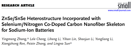 為解決金屬硫族化合物作為鈉離子電池負極材料時,在轉化-合金化過程中伴隨著的體積膨脹變形和活性材料粉化導致電極接觸減弱,從集電器上剝落等問題,孫靈娜教授團隊首先將ZnSn(OH)6納米盒狀前驅體與聚丙烯腈(PAN)進行靜電紡絲,得到三維自支撐網絡,經過碳化和硒化熱處理后,開發出嵌入Se/N共摻雜CNF骨架中的ZnSe/SnSe異質結構(ZnSe/SnSe@Se,N-CNFs)。獨特的ZnSe/SnSe異質結構、靜電紡絲CNF和Se/N共摻雜特性可有效促進電子/離子傳輸速率,提高結構穩定性,加速電化學反應動力學:I) ZnSe/SnSe中的異質邊界將提供增強的界面耦合效應和內置電場,具有額外的電荷轉移驅動力,可吸引更多Na+離子吸附在異質界面上,提高Na+離子從電解液到電極的遷移速率,從而有效加速電化學反應動力學。Ⅱ) 嵌入ZnSe/SnSe納米盒的三維自支撐CNF網絡不僅能增強半導體ZnSe/SnSe的導電性,還能避免在嵌入/脫出過程中發生劇烈的體積膨脹/收縮,改善其結構的完整性。Ⅲ) Se/N共摻雜特性實現了CNF基體與硒化異質結構之間的耦合效應,實現了離子/電子的快速傳輸,加速了鈉離子儲存的表面/內部反應動力學,并增強了CNF基體的電子導電性和電解液潤濕性。這項研究為解決目前合金基材料在鈉離子電池中所面臨的挑戰提供了一些具有啟發性的設計思路:通過異質納米結構構建、碳殼涂層和共摻雜改性策略,提高了導電性;通過將合金材料嵌入具有三維獨立骨架特征的碳基體,解決了體積膨脹問題。該論文《ZnSe/SnSe Heterostructure Incorporated with Selenium/Nitrogen Co-Doped Carbon Nanofiber Skeleton for Sodium-Ion Batteries》發表在《Small》(影響因子13.3,中科院JCR 2 區),深圳大學化學與環境工程學院張穎朦研究員、碩士研究生程樂樂為共同第一作者,張穎朦研究員、孫靈娜教授為共同通訊作者,深圳大學化學與環境工程學院為通訊單位。