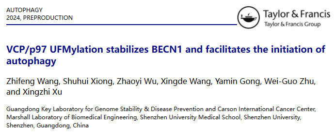 2024年5月,深圳大學醫學部許興智教授團隊在國際頂級期刊Autophagy發表題為“VCP/p97 UFMylation stabilizes BECN1 and facilitates the initiation of autophagy”的研究論文。這是許興智教授團隊繼2019年首次詮釋UFMylation在DNA損傷應答(DDR)中促進DDR核心激酶ATM活化和上月(2024年4月)揭示UFMylation維持被阻滯復制叉穩定性的分子機制后,再次率先揭示了UFMylation促進細胞自噬的作用機理。深圳大學醫學部助理教授王志峰博士為第一作者,王志峰助理教授和許興智教授為共同通訊作者,深圳大學為第一單位。
