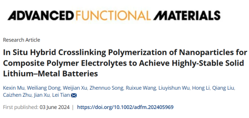 Kexin Mu, Weiliang Dong, Weijian Xu, Zhennuo Song, Ruixue Wang, Liuyishun Wu, Hong Li, Qiang Liu, Caizhen Zhu, Jian Xu, and Lei Tian*,In Situ Hybrid Crosslinking Polymerization of Nanoparticles for Composite Polymer Electrolytes to Achieve Highly-Stable Solid Lithium–Metal Batteries.Adv. Funct. Mater.2024, 2405969
