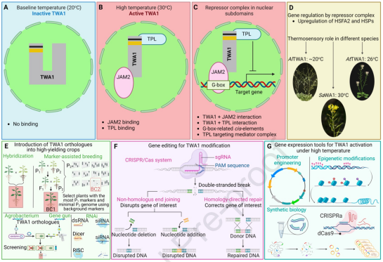 隨著氣候變化導致全球氣溫上升,農作物越來越多地受到超過其最佳適應溫度范圍的影響,從而導致熱應激。熱應激影響植物的許多形態生理、生化和分子機制,最終影響全球可持續農業生產。Bohn 等人最近在植物細胞中發現了一種新的熱感受器“THERMO-WITH ABA-RESPONSE 1 (TWA1)”。如圖所示,TWA1作為基因調節蛋白,通過改變脅迫感受基因的表達來調控植物對熱應激的響應。該研究最重要的發現是 TWA1 介導的響應機制具有高度的溫度依賴特性。