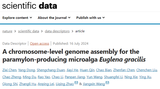 2024年7月16日,深圳大學(xué)生命與海洋科學(xué)學(xué)院王江新教授與化學(xué)與環(huán)境工程學(xué)院趙麗青教授團(tuán)隊(duì)在Nature出版集團(tuán)旗下期刊ScientificData(五年平均影響因子:8.9)發(fā)表題為“A chromosome-level genome assembly for the paramylon-producing microalgaEuglena gracilis”的研究論文。研究團(tuán)隊(duì)利用二代Illumina、三代PacBio、Bionano以及Hi-C測(cè)序技術(shù),組裝得到高質(zhì)量的染色體級(jí)基因組圖譜。該基因組大小約2.37Gb,包含46條染色體,contigN50為619Kb,scaffoldN50為1.12Mb,并注釋到了39362個(gè)蛋白編碼基因。