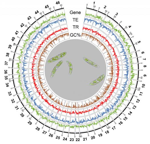 纖細(xì)裸藻染色體級(jí)基因組圖譜,展示了其多層次基因組特征:外圈數(shù)字代表46條染色體編號(hào)。圖譜分為四層:基因密度(綠色)、轉(zhuǎn)座子密度(藍(lán)色)、串聯(lián)重復(fù)序列密度(紅色),反映各類元件在基因組中分布的整體情況;GC含量百分比(棕色),反映不同染色體區(qū)域堿基組成。中心為纖細(xì)裸藻的顯微鏡圖像。