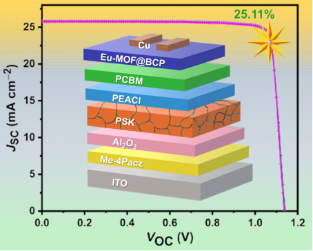鈣鈦礦太陽能電池憑借器件效率優(yōu)異、成本效益高、制備工藝擴展性強等優(yōu)勢,成為光伏電池研究領(lǐng)域的熱點。目前,其單節(jié)電池效率已達到26.5%,但是,界面能帶非理想彎曲及深能級的表界面缺陷嚴重影響電池效率和穩(wěn)定性。本工作中,研究者首先在FACsPbI3基鈣鈦礦中引入硫氰酸鉛(Pb(SCN)2)作為添加劑,增強晶粒尺寸、鈍化晶界缺陷、提升載流子遷移率。其次,引入Al2O3納米顆粒作為Me-4PACz空穴傳輸層的界面修飾劑,增強表面潤濕性以促進高質(zhì)量鈣鈦礦薄膜的生長,同時提升器件的環(huán)境穩(wěn)定性。最后,創(chuàng)新性設(shè)計Eu-MOF修飾陰極緩沖層,能夠部分滲入PCBM中,從而優(yōu)化界面能帶排列。該修飾的陰極緩沖層能同時鈍化缺陷、增強電子傳輸、阻隔空穴反流。基于此,該倒置鈣鈦礦太陽能電池的效率提升至25.11%,電流密度和填充因子分別達到25.85 mA/cm2和85.11%。在65 °C 的環(huán)境空氣中,相當于1個太陽光照的白光LED下老化1000小時后,最優(yōu)器件仍可保持其初始效率的94%。本研究揭示的界面工程可為高效高穩(wěn)定鈣鈦礦太陽能電池的研制提供一定的指導作用。