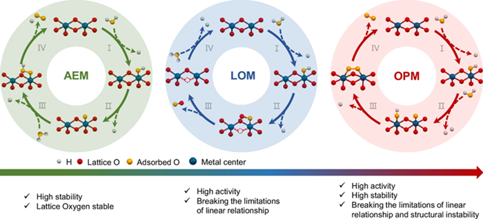 圖1. AEM、LOM、OPM反應路徑及其特點的示意圖。