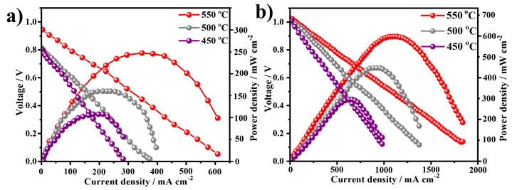 Fig. 4.Fuel cell performance in terms of current density and voltage (I-V) and current density and power density (I–P) of theaCCTO andbCCTO–NCAL heterostructure electrolyte cells in the H2/air environments at operational temperature of 550–450 °C.
