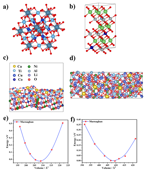 Fig. 1.Optimal and relaxed crystal structures of CCTO and NCAL. c, d Top and side view of the CCTO–NCAL heterostructure crystal structures and e, f calculated values of energy vs volume of CCTO and NCAL via Murnaghan method.