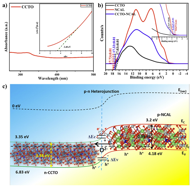 Fig. 5. aUV–Vis spectra of CCTO, complete spectrum and energy optical gap.bUPS spectra cutoff energy region, and onset energy region of CCTO, NCAL, and CCTO–NCAL.cEnergy band diagram of fuel cell CCTO–NCAL heterostructure obtained according to UPS results and energy band gap