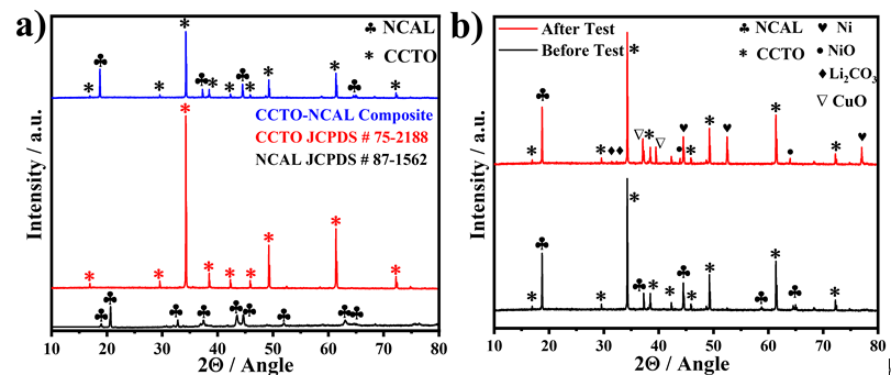 Fig. 2.X-ray diffraction patterns of NCAL, CCTO, and their heterostructure CCTO–NCAL. b X-ray diffraction patterns of CCTO–NCAL heterostructure before and after testing in fuel cell operation